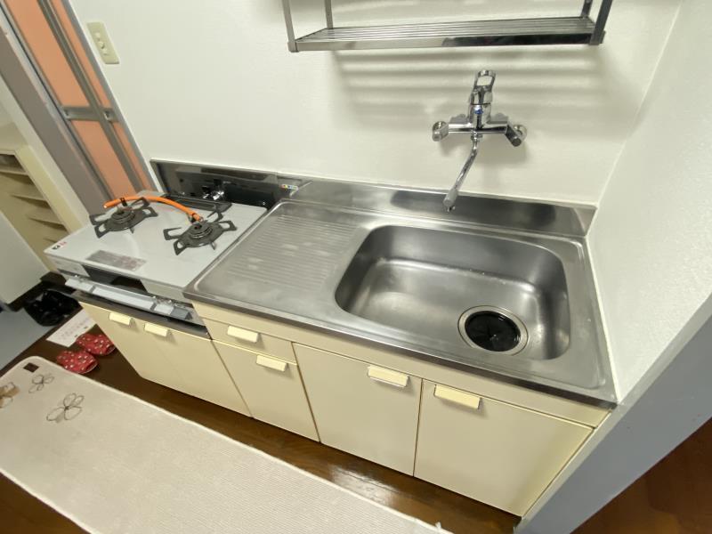 こちらのキッチン。調理器具を置けるスペースが確保されていて、かつ、二口コンロも完備。